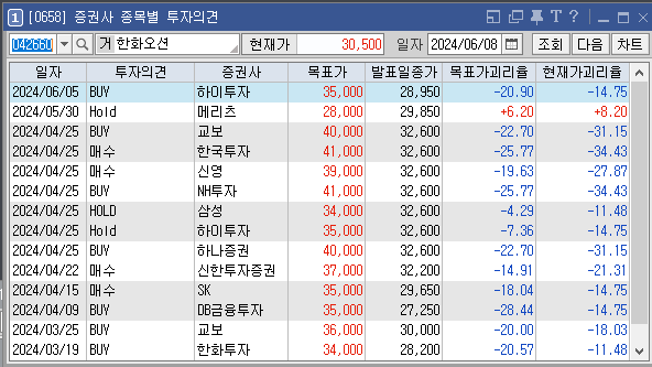 증권사별로 한화오션의 목표주가는 어떻게 추정하고 있는지와 투자의견은 어떠한지 살펴보겠습니다. 가장 최근에 증권사 SK에서 설정한 한화오션 목표가는 35000원이고 투자의견은 '매수'로 설정해놨습니다. 이전에 설정한 목표가 35000원, 36000원도 투자에 참고하시면 좋을것 같습니다