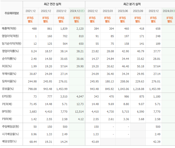 제룡전기의 재무를 살펴보면 전년도 매출액은 1839억원이고 영업이익 702억원, 당기순이익은 564억원을 기록했었습니다. 전년도 부채비는 27.14% 정도 지고 있습니다. 이어서 제룡전기의 매분기 실적도 검토해 보겠습니다. 전분기 매출액은 658억원이고 영업이익은 248억원이었습니다. 그에따른 당기순이익은 총 189억원을 기록했고, 부채비는 27.14% 입니다.
