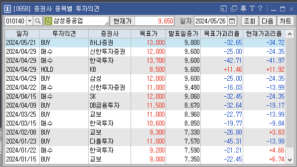 증권사별로 삼성중공업의 목표주가는 어떻게 추정하고 있는지와 투자의견은 어떠한지 살펴보겠습니다. 가장 최근에 증권사 SK에서 설정한 삼성중공업 목표가는 13000원이고 투자의견은 '매수'로 설정해놨습니다. 이전에 설정한 목표가 12000원, 11000원도 투자에 참고하시면 좋을것 같습니다