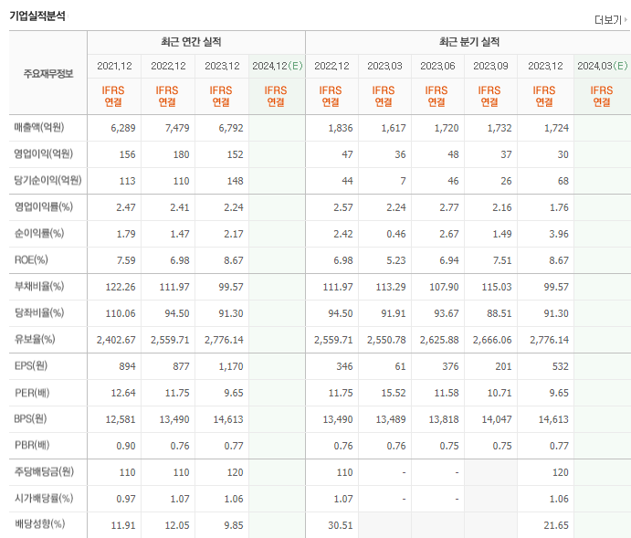 한국석유은 어떤 기업인지 먼저 정리해보고, 이어서 투자정보도 살펴보겠습니다. 한국석유의 시총은 2,666억원이고, 시총 순위는 코스피 526위이며, 총 상장주식수는 12694120주 입니다. 그 밖에 PER, EPS는 각각 17.95배 l 1,170원이며, 동일 업종 PER이 36.37배인 것을 고려해서 현재 한국석유의 PER과 비교해보면 좋을것 같습니다. 현재 한 주당 배당금은 약 120원 이며 그에따른 시가 배당률은 1.06% 입니다. 그럼 이어서 한국석유의 재무실적 살펴보도록 하겠습니다.
