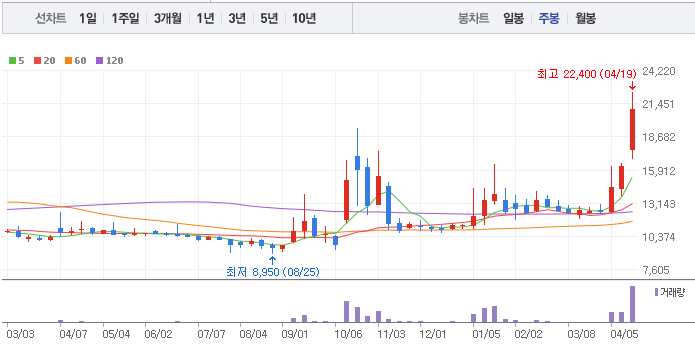 22,000원 부근에서는 쌍봉 형태의 고점 패턴을 만들고 있지만, 아직 고점에서 매도한 흔적은 보이지 않습니다. 특히 4월 19일에 5,000억 원의 거래대금이 터지면서 장대양봉을 만들었습니다. 이후 4월 22일부터 3일간 단일가에 걸리면서 하락했지만, 추가 이벤트 발생 시 22,000원까지의 추가 상승이 기대됩니다.