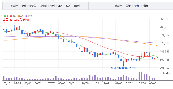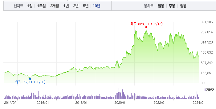 삼성SDI의 1년간 주가 흐름을 분석해보겠습니다. 삼성SDI 주가가 최고가를 기록했을때와 최저가를 기록했을때의 주가는 각각 745,000 l 342,000 이었습니다. 삼성SDI의 5년, 10년 차트를 보시면서 현재 삼성SDI의 흐름을 파악해보시는것도 투자에 큰 도움이 되실겁니다. 이어서 삼성SDI 목표주가에 대해 정리해보도록 하겠습니다.