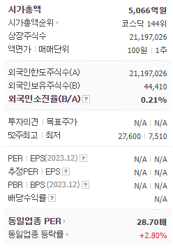 에스피소프트은 어떤 기업인지 먼저 정리해보고, 이어서 투자정보도 살펴보겠습니다. 에스피소프트의 시총은 5,066억원이고, 시총 순위는 코스닥 144위이며, 총 상장주식수는 21197026주 입니다. 그 밖에 PER, EPS는 각각 N/A l N/A이며, 동일 업종 PER이 28.70배인 것을 고려해서 현재 에스피소프트의 PER과 비교해보면 좋을것 같습니다. 현재 한 주당 배당금은 약 원 이며 그에따른 시가 배당률은 % 입니다. 그럼 이어서 에스피소프트의 재무실적 살펴보도록 하겠습니다.