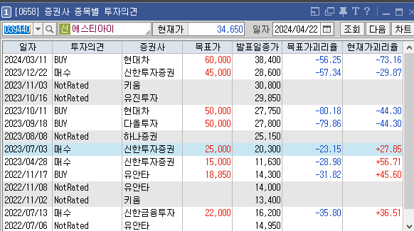 증권사별로 에스티아이의 목표주가는 어떻게 추정하고 있는지와 투자의견은 어떠한지 살펴보겠습니다. 가장 최근에 증권사 현대차에서 설정한 에스티아이 목표가는 60000원이고 투자의견은 'BUY'로 설정해놨습니다. 이전에 설정한 목표가 45000원, 원도 투자에 참고하시면 좋을것 같습니다