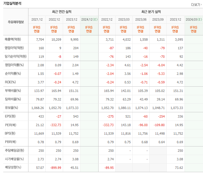 대성에너지은 어떤 기업인지 먼저 정리해보고, 이어서 투자정보도 살펴보겠습니다. 대성에너지의 시총은 2,448억원이고, 시총 순위는 코스피 563위이며, 총 상장주식수는 27500000주 입니다. 그 밖에 PER, EPS는 각각 16.39배 l 543원이며, 동일 업종 PER이 36.15배인 것을 고려해서 현재 대성에너지의 PER과 비교해보면 좋을것 같습니다. 현재 한 주당 배당금은 약 250원 이며 그에따른 시가 배당률은 3.08% 입니다. 그럼 이어서 대성에너지의 재무실적 살펴보도록 하겠습니다.