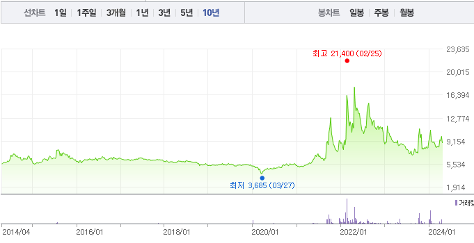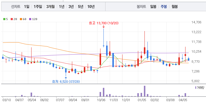 대성에너지의 1년간 주가 흐름을 분석해보겠습니다. 대성에너지 주가가 최고가를 기록했을때와 최저가를 기록했을때의 주가는 각각 13,700 l 6,520 이었습니다. 대성에너지의 5년, 10년 차트를 보시면서 현재 대성에너지의 흐름을 파악해보시는것도 투자에 큰 도움이 되실겁니다. 이어서 대성에너지 목표주가에 대해 정리해보도록 하겠습니다.