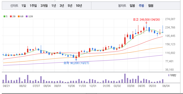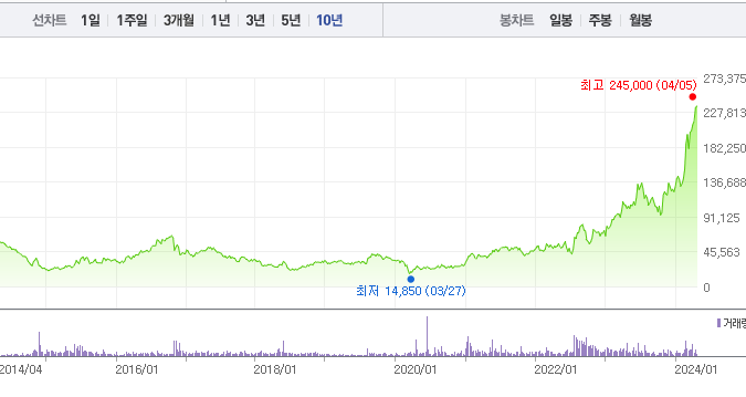 한화에어로스페이스의 1년간 주가 흐름을 분석해보겠습니다. 한화에어로스페이스 주가가 최고가를 기록했을때와 최저가를 기록했을때의 주가는 각각 245,000 l 90,200 이었습니다. 한화에어로스페이스의 5년, 10년 차트를 보시면서 현재 한화에어로스페이스의 흐름을 파악해보시는것도 투자에 큰 도움이 되실겁니다. 이어서 한화에어로스페이스 목표주가에 대해 정리해보도록 하겠습니다.