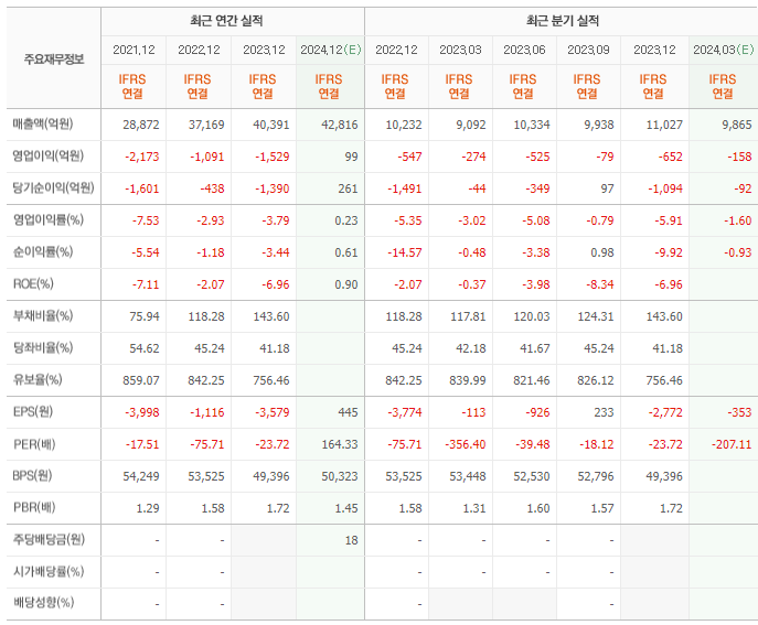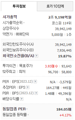 HD현대미포은 어떤 기업인지 먼저 정리해보고, 이어서 투자정보도 살펴보겠습니다. HD현대미포의 시총은 2조 9,198억원이고, 시총 순위는 코스피 114위이며, 총 상장주식수는 39942149주 입니다. 그 밖에 PER, EPS는 각각 N/A l -3,579원이며, 동일 업종 PER이 184.05배인 것을 고려해서 현재 HD현대미포의 PER과 비교해보면 좋을것 같습니다. 현재 한 주당 배당금은 약 원 이며 그에따른 시가 배당률은 % 입니다. 그럼 이어서 HD현대미포의 재무실적 살펴보도록 하겠습니다.