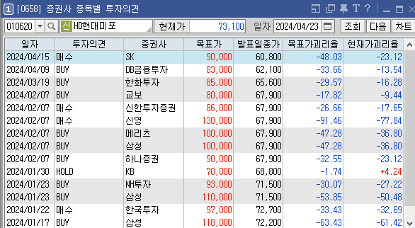증권사별로 HD현대미포의 목표주가는 어떻게 추정하고 있는지와 투자의견은 어떠한지 살펴보겠습니다. 가장 최근에 증권사 SK에서 설정한 HD현대미포 목표가는 90000원이고 투자의견은 '매수'로 설정해놨습니다. 이전에 설정한 목표가 83000원, 85000원도 투자에 참고하시면 좋을것 같습니다