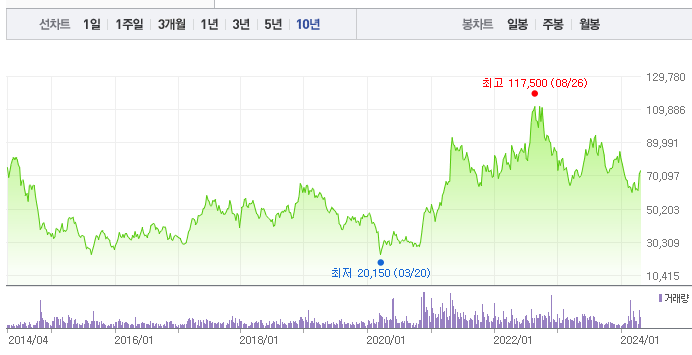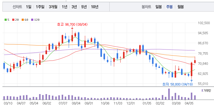 HD현대미포의 1년간 주가 흐름을 분석해보겠습니다. HD현대미포 주가가 최고가를 기록했을때와 최저가를 기록했을때의 주가는 각각 96,700 l 58,800 이었습니다. HD현대미포의 5년, 10년 차트를 보시면서 현재 HD현대미포의 흐름을 파악해보시는것도 투자에 큰 도움이 되실겁니다. 이어서 HD현대미포 목표주가에 대해 정리해보도록 하겠습니다.