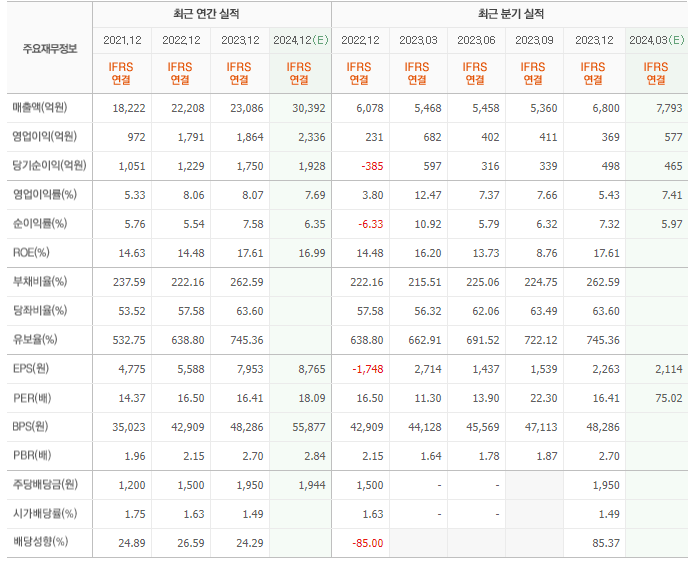 24년에는 연결 매출액이 2.9조원, 영업이익이 2,517억원으로 예상됩니다. 지난해 말 기준으로 수주잔고가 19.6조원으로 전년대비 59.7% 상승하여 사우디아라비아향 천궁-II 10개포대의 수주 4.3조원이 4분기에 인식되었습니다. 이는 두 번째 중동 수출 수주로, 사우디의 추가 수주 가능성도 열린 상태입니다. 이러한 수주 증가로 매출액이 두 자릿수 증가할 것으로 전망되며, 특히 중동 수출의 납품이 본격화되면서 4~5년간의 성장이 예상됩니다.