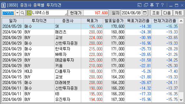 증권사별로 LIG넥스원의 목표주가는 어떻게 추정하고 있는지와 투자의견은 어떠한지 살펴보겠습니다. 가장 최근에 증권사 교보에서 설정한 LIG넥스원 목표가는 200000원이고 투자의견은 'BUY'로 설정해놨습니다. 이전에 설정한 목표가 208000원, 190000원도 투자에 참고하시면 좋을것 같습니다