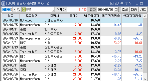 증권사별로 HMM의 목표주가는 어떻게 추정하고 있는지와 투자의견은 어떠한지 살펴보겠습니다. 가장 최근에 증권사 신한투자증권에서 설정한 HMM 목표가는 17000원이고 투자의견은 'Trading BUY'로 설정해놨습니다. 이전에 설정한 목표가 21000원, 17500원도 투자에 참고하시면 좋을것 같습니다