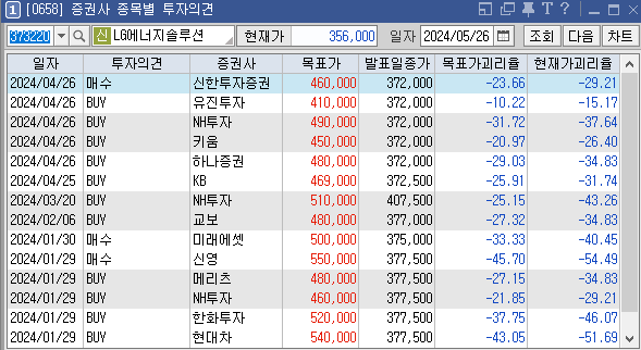 증권사별로 LG에너지솔루션의 목표주가는 어떻게 추정하고 있는지와 투자의견은 어떠한지 살펴보겠습니다. 가장 최근에 증권사 NH투자에서 설정한 LG에너지솔루션 목표가는 460000원이고 투자의견은 'BUY'로 설정해놨습니다. 이전에 설정한 목표가 410000원, 490000원도 투자에 참고하시면 좋을것 같습니다