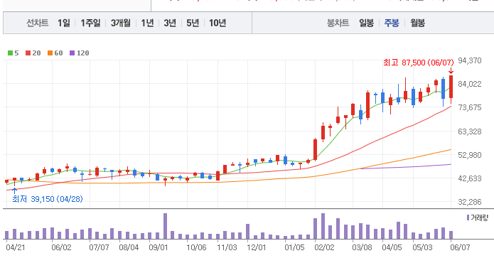 SK스퀘어의 1년간 주가 흐름을 분석해보겠습니다. SK스퀘어 주가가 최고가를 기록했을때와 최저가를 기록했을때의 주가는 각각 83,900 l 39,150 이었습니다. SK스퀘어의 5년, 10년 차트를 보시면서 현재 SK스퀘어의 흐름을 파악해보시는것도 투자에 큰 도움이 되실겁니다. 이어서 SK스퀘어 목표주가에 대해 정리해보도록 하겠습니다.