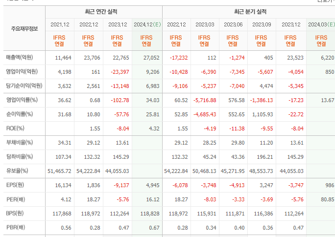 SK스퀘어의 재무를 살펴보면 전년도 매출액은 22765억원이고 영업이익 -23397억원, 당기순이익은 -13148억원을 기록했었습니다. 전년도 부채비는 13.61% 정도 지고 있습니다. 이어서 SK스퀘어의 매분기 실적도 검토해 보겠습니다. 전분기 매출액은 23523억원이고 영업이익은 -4054억원이었습니다. 그에따른 당기순이익은 총 -5345억원을 기록했고, 부채비는 13.61% 입니다.