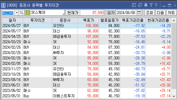 증권사별로 SK스퀘어의 목표주가는 어떻게 추정하고 있는지와 투자의견은 어떠한지 살펴보겠습니다. 가장 최근에 증권사 SK에서 설정한 SK스퀘어 목표가는 100000원이고 투자의견은 '매수'로 설정해놨습니다. 이전에 설정한 목표가 84000원, 90000원도 투자에 참고하시면 좋을것 같습니다