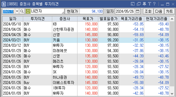 증권사별로 LG전자의 목표주가는 어떻게 추정하고 있는지와 투자의견은 어떠한지 살펴보겠습니다. 가장 최근에 증권사 키움에서 설정한 LG전자 목표가는 150000원이고 투자의견은 'BUY'로 설정해놨습니다. 이전에 설정한 목표가 140000원, 145000원도 투자에 참고하시면 좋을것 같습니다