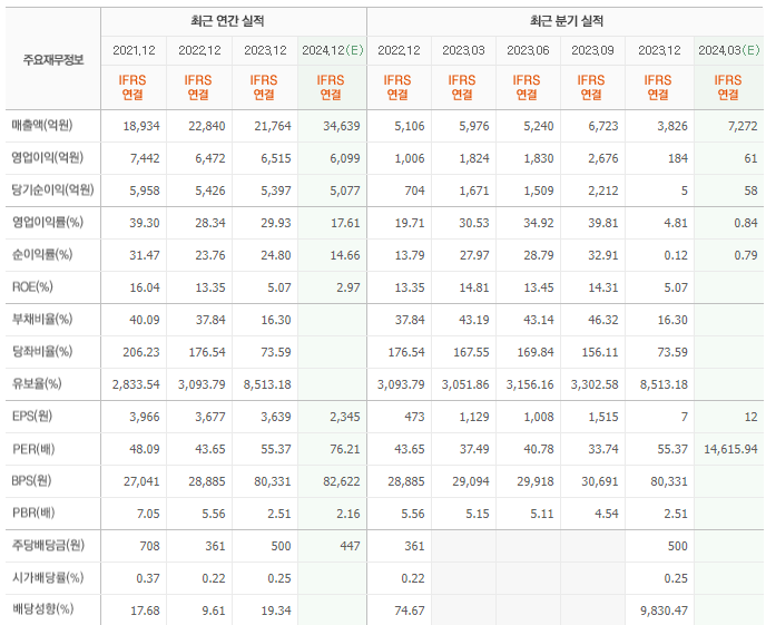 1분기 24년의 연결 매출은 7,454억원으로 전년대비 24.7% 증가했으며, 영업이익은 75억원으로 전년대비 95.9% 감소하여 OPM은 1.0%로 나타났습니다. 이는 합병 후 발생한 판권 관련 PPA(Purchase Price Allocation)가 분기별 700억씩 반영되어 영업이익이 약화된 것입니다. 하지만 하반기에는 PPA 상각비 규모가 분기별 70억원으로 감소하고 매출 원가율도 낮아지면서 큰 폭으로 수익성이 개선될 것으로 예상됩니다.
