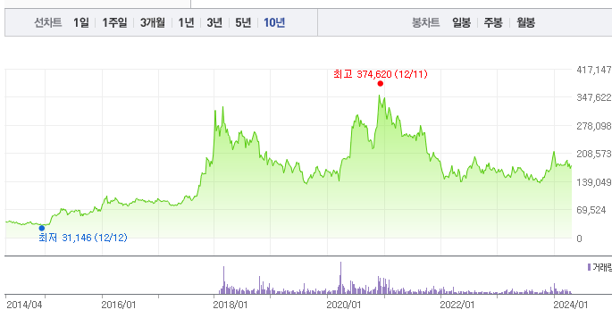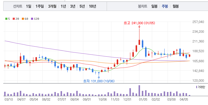 셀트리온의 1년간 주가 흐름을 분석해보겠습니다. 셀트리온 주가가 최고가를 기록했을때와 최저가를 기록했을때의 주가는 각각 241,000 l 131,000 이었습니다. 셀트리온의 5년, 10년 차트를 보시면서 현재 셀트리온의 흐름을 파악해보시는것도 투자에 큰 도움이 되실겁니다. 이어서 셀트리온 목표주가에 대해 정리해보도록 하겠습니다.