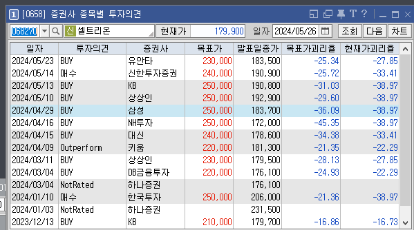 증권사별로 셀트리온의 목표주가는 어떻게 추정하고 있는지와 투자의견은 어떠한지 살펴보겠습니다. 가장 최근에 증권사 유안타에서 설정한 셀트리온 목표가는 230000원이고 투자의견은 'BUY'로 설정해놨습니다. 이전에 설정한 목표가 240000원, 250000원도 투자에 참고하시면 좋을것 같습니다