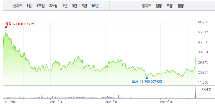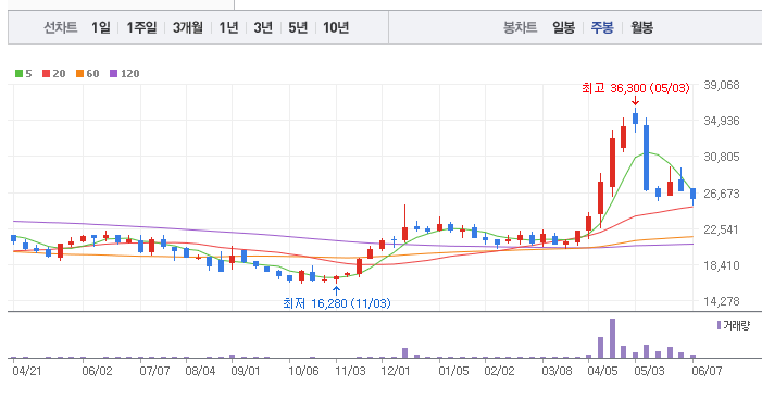 그러나 5월 8일 부진한 실적 발표 이후 주가가 하락하고 있습니다. 단기 급등으로 인한 피로감과 35,000원선의 박스권 돌파 여부에 대한 시장의 망설임이 월봉차트에서 보여지며, 부진한 실적이 트리거가 되어 주가 조정으로 방향을 잡고 있는 모습입니다.
