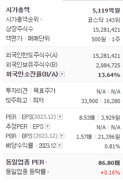 현재 주가가 더 조정을 받을지, 기관과 외인이 함께 올린 주가가 박스권을 뚫고 오를지는 불확실합니다. 밸류에이션을 계산해보면, 3월 21일 포스팅 당시 주가 21,000원 기준 PER 5.3으로 매력적이었으나, 5월 9일 조정 중인 주가 32,500원 기준 PER는 8.3으로, 고평가도 저평가도 아닌 상태입니다.