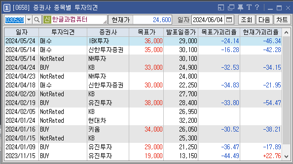 증권사별로 한글과컴퓨터의 목표주가는 어떻게 추정하고 있는지와 투자의견은 어떠한지 살펴보겠습니다. 가장 최근에 증권사 KB에서 설정한 한글과컴퓨터 목표가는 33000원이고 투자의견은 'BUY'로 설정해놨습니다. 이전에 설정한 목표가 30000원, 38000원도 투자에 참고하시면 좋을것 같습니다