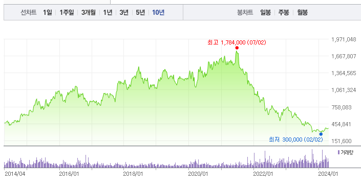 LG생활건강의 1년간 주가 흐름을 분석해보겠습니다. LG생활건강 주가가 최고가를 기록했을때와 최저가를 기록했을때의 주가는 각각 632,000 l 300,000 이었습니다. LG생활건강의 5년, 10년 차트를 보시면서 현재 LG생활건강의 흐름을 파악해보시는것도 투자에 큰 도움이 되실겁니다. 이어서 LG생활건강 목표주가에 대해 정리해보도록 하겠습니다.