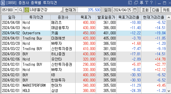 증권사별로 LG생활건강의 목표주가는 어떻게 추정하고 있는지와 투자의견은 어떠한지 살펴보겠습니다. 가장 최근에 증권사 메리츠에서 설정한 LG생활건강 목표가는 400000원이고 투자의견은 'Hold'로 설정해놨습니다. 이전에 설정한 목표가 430000원, 450000원도 투자에 참고하시면 좋을것 같습니다