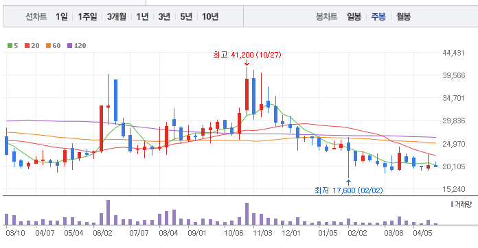 현대바이오의 1년간 주가 흐름을 분석해보겠습니다. 현대바이오 주가가 최고가를 기록했을때와 최저가를 기록했을때의 주가는 각각 41,200 l 17,600 이었습니다. 현대바이오의 5년, 10년 차트를 보시면서 현재 현대바이오의 흐름을 파악해보시는것도 투자에 큰 도움이 되실겁니다. 이어서 현대바이오 목표주가에 대해 정리해보도록 하겠습니다.