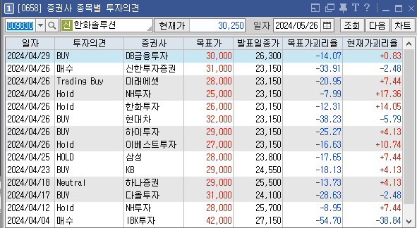 증권사별로 한화솔루션의 목표주가는 어떻게 추정하고 있는지와 투자의견은 어떠한지 살펴보겠습니다. 가장 최근에 증권사 KB에서 설정한 한화솔루션 목표가는 30000원이고 투자의견은 'BUY'로 설정해놨습니다. 이전에 설정한 목표가 31000원, 28000원도 투자에 참고하시면 좋을것 같습니다