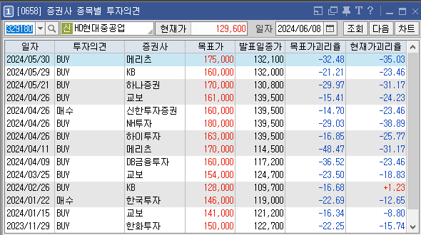 증권사별로 HD현대중공업의 목표주가는 어떻게 추정하고 있는지와 투자의견은 어떠한지 살펴보겠습니다. 가장 최근에 증권사 메리츠에서 설정한 HD현대중공업 목표가는 170000원이고 투자의견은 'BUY'로 설정해놨습니다. 이전에 설정한 목표가 160000원, 154000원도 투자에 참고하시면 좋을것 같습니다
