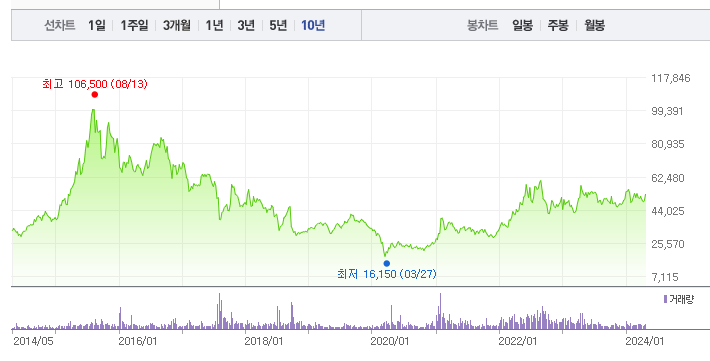 한국항공우주의 1년간 주가 흐름을 분석해보겠습니다. 한국항공우주 주가가 최고가를 기록했을때와 최저가를 기록했을때의 주가는 각각 58,000 l 43,600 이었습니다. 한국항공우주의 5년, 10년 차트를 보시면서 현재 한국항공우주의 흐름을 파악해보시는것도 투자에 큰 도움이 되실겁니다. 이어서 한국항공우주 목표주가에 대해 정리해보도록 하겠습니다.