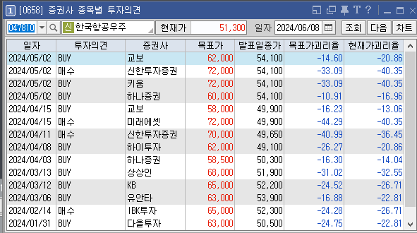 증권사별로 한국항공우주의 목표주가는 어떻게 추정하고 있는지와 투자의견은 어떠한지 살펴보겠습니다. 가장 최근에 증권사 교보에서 설정한 한국항공우주 목표가는 58000원이고 투자의견은 'BUY'로 설정해놨습니다. 이전에 설정한 목표가 72000원, 70000원도 투자에 참고하시면 좋을것 같습니다