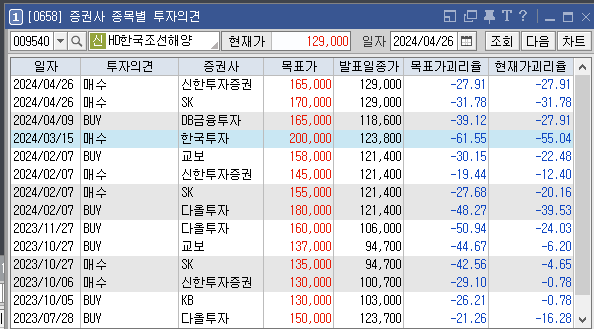 증권사별로 HD한국조선해양의 목표주가는 어떻게 추정하고 있는지와 투자의견은 어떠한지 살펴보겠습니다. 가장 최근에 증권사 신한투자증권에서 설정한 HD한국조선해양 목표가는 165000원이고 투자의견은 '매수'로 설정해놨습니다. 이전에 설정한 목표가 170000원, 165000원도 투자에 참고하시면 좋을것 같습니다