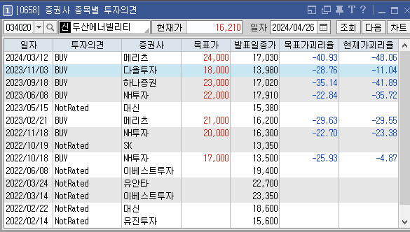 증권사별로 두산에너빌리티의 목표주가는 어떻게 추정하고 있는지와 투자의견은 어떠한지 살펴보겠습니다. 가장 최근에 증권사 메리츠에서 설정한 두산에너빌리티 목표가는 24000원이고 투자의견은 'BUY'로 설정해놨습니다. 이전에 설정한 목표가 18000원, 23000원도 투자에 참고하시면 좋을것 같습니다